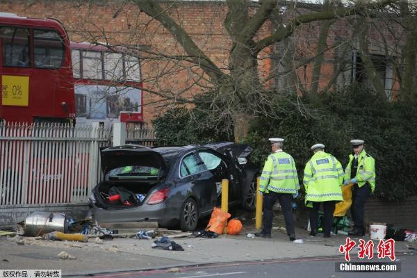 2月26日,在英国伦敦,警察在事故现场调查。英国伦敦26日发生一起车辆冲撞行人事件,造成5人受伤。警方称这起事件并非恐怖袭击,驾车者疑为酒驾。司机因涉嫌驾驶危险而被捕。