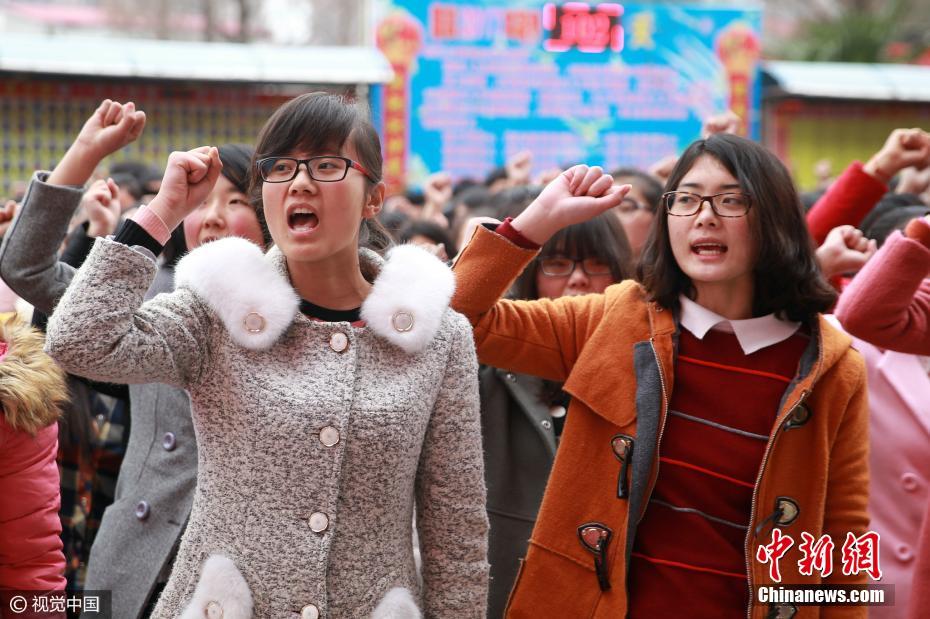 河南高中百天誓师。高三学子们振臂高呼“我要上重点、我要上一本、我要上北大”的豪迈誓言,为迎战高考鼓劲加油。图片来源:视觉中国