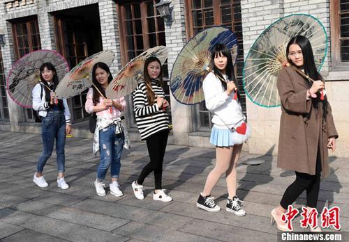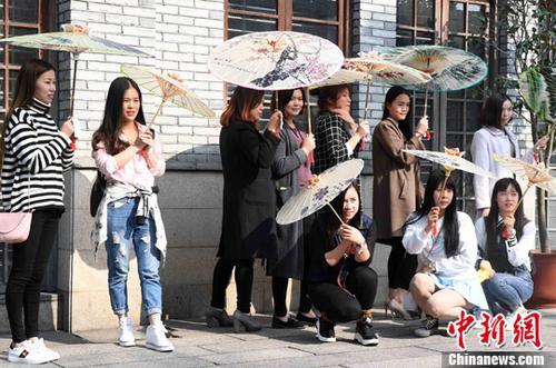 3月1日,福州春光明媚。数名女青年手持油纸伞在福州一景区摆造型。中新社记者 刘可耕 摄