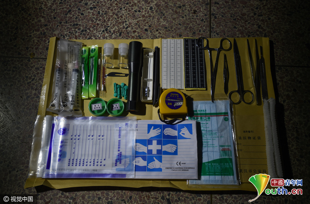 2017年2月24日,武汉,韩煦出现场所携带的工具和用品,包括剪刀,镊子,物证取样盒、手电、注射器、法医物证袋等等。