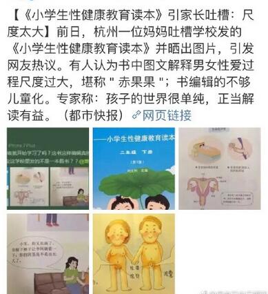 小学性读本引吐槽,有人认为太赤裸裸也有人为此赞赏。近日,一位家长在微博上吐槽学校发的《小学生性健康教育读本》尺度太大,引发网友热议和多家媒体报道。对于这一教材的内容,有网友和家长表示尺度大到“目瞪口呆”,认为内容太“赤裸裸”,“就是黄色漫画”,不认同这样的内容出现在小学生课本里;也有不少人表示赞赏,认为性教育没必要遮遮掩掩。