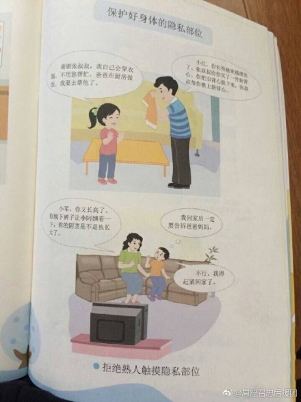 博主贴在网上的教材,但只拍到画面的一半,原意为“不要给别人看自己的生殖器”。有网友认为不断章取义的话就没问题。