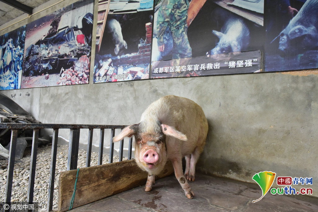 2017年03月03日,四川省成都市,建川博物馆,在汶川大地震中被埋36天后得救的一只母猪,被冠以“猪坚强”之名。八年多过去了,猪坚强住在建川博物馆提供的一室一厅里,有专人伺候有保健医生看病。虽然年纪渐大,腿脚不便,但每天工作人员都要陪它溜达两次。之前有传言猪坚强已死,一名杭州的女孩还专门打飞的到四川求证。供图:视觉中国