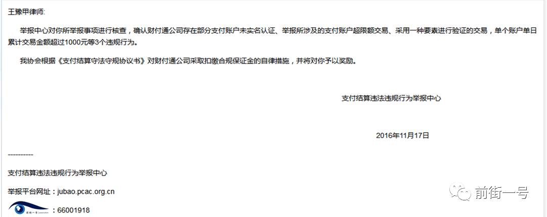 2016年11月17日,王豫甲收到支付结算违法违规行为举报中心的回复,内容为:举报中心对其所举报事项进行核查,确认财付通公司存在部分支付账户未实名认证、举报所涉及的支付账户超限额交易、采用一种要素进行验证的交易,单个账户单日累积交易金额超过1000元等3个违规行为。中国支付清算协会根据《支付结算守法守规协议书》对财付通公司采取扣缴合规保证金的自律措施,并将对王豫甲予以奖励。