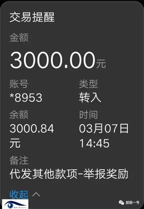 3月7日,王豫甲收到中国支付清算协会发给他的3000元举报奖励。