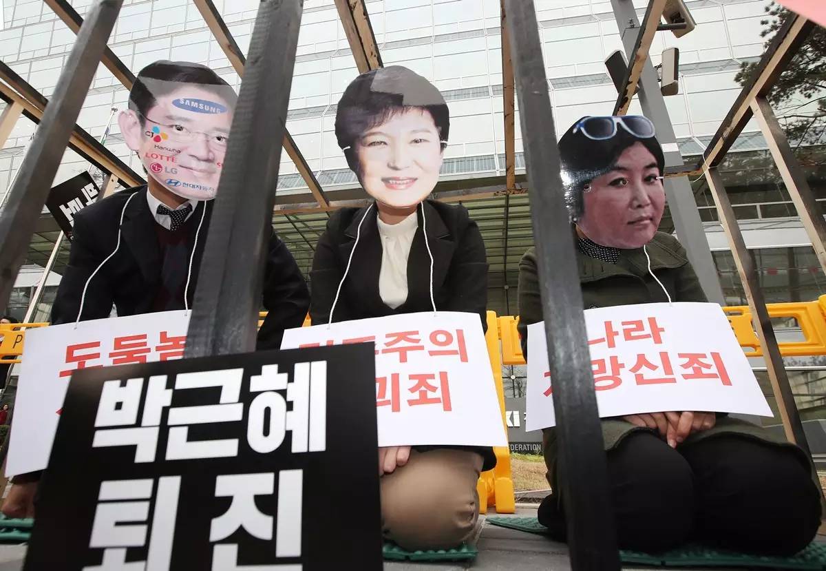 2016年末,首尔街头抗议“亲信门”丑闻的示威者头戴李在镕、朴槿惠、崔顺实三人的面具,跪地要求政府加快调查步骤