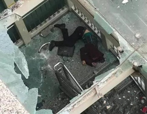 从另一个角度的视频中可以看到,小车当时撞上两人,其中一人身手矫健没被撞下桥,而另一名男子却不幸摔下天桥,砸碎了楼梯玻璃,摔到了楼梯平台上。