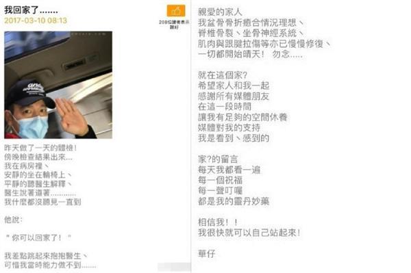 刘德华今年1月在泰国拍广告时意外坠马受伤,今日他发文《我回家了》,宣布出院。刘德华表示昨天做了一天的检查,当医生说“可以回家了”,他差点跳起来抱抱医生。刘德华透露盆骨骨折愈合情况理想,脊椎骨裂、坐骨神经系统、肌肉与跟腱拉伤等亦已慢慢修复,很快就可以自己站起来。