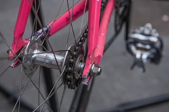 死飞自行车没有刹车,可以原地后退,关键就在于后轮上的固齿轮轴 。