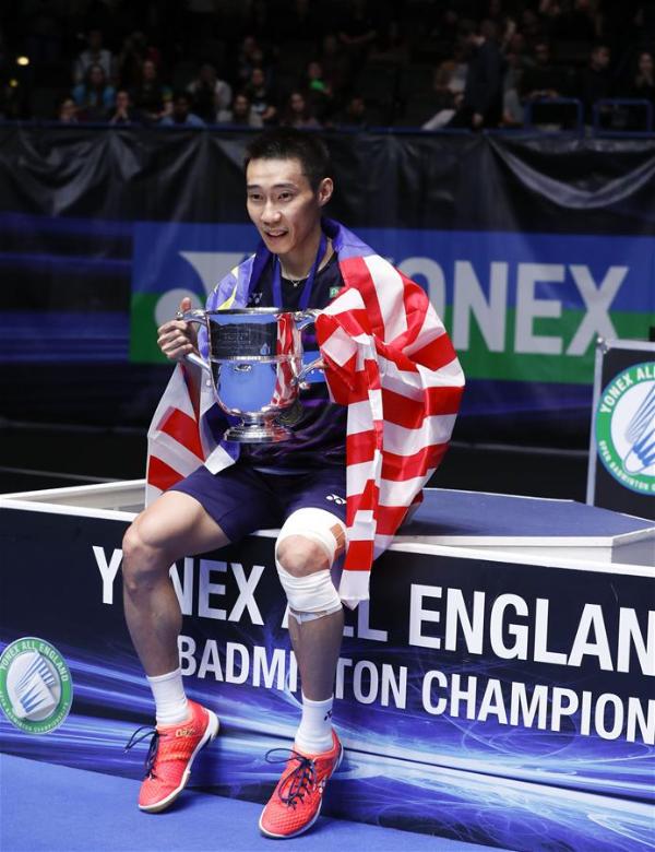3月12日,李宗伟在颁奖仪式上。当日,在英国伯明翰进行的2017全英羽毛球公开赛男单决赛中,马来西亚选手李宗伟以2比0战胜中国选手石宇奇,夺得冠军。 新华社记者韩岩摄