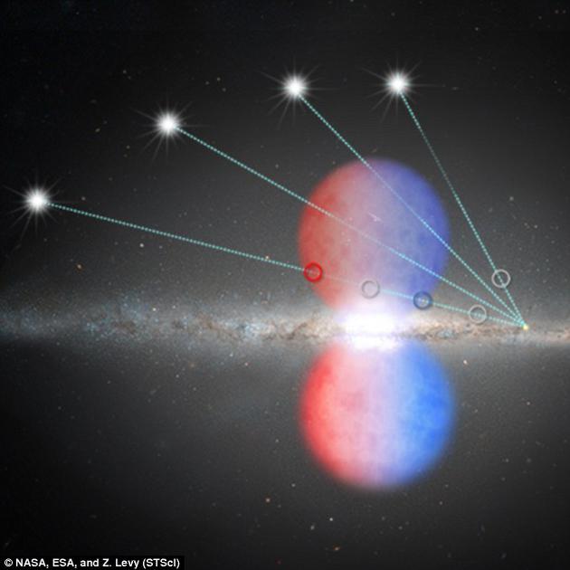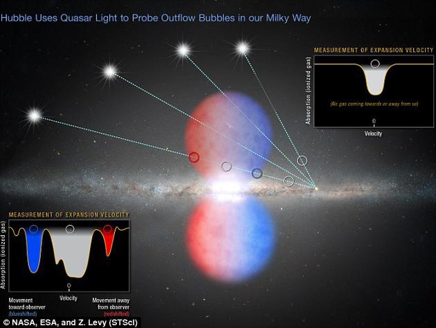 此前一项研究认为,这些气泡约形成于200万年前。它们是由被加热到极高温后沿着黑洞旋转轴向外逃逸的气体形成的。研究人员分析了哈勃望远镜的宇宙起源频谱仪对北侧气泡的观测结果,其中包含47颗遥远的类星体,正是它们构成了银河系明亮的中心部位。