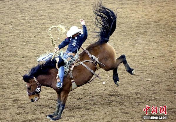 当地时间3月12日,全球最大规模室内牲畜展和牛仔竞技赛——休斯敦牛仔节(Houston Livestock Show and Rodeo)在NRG公园举行。拥有85年历史的牛仔节已成为美国南部地区的传统盛事,除了骑牛、赛马等牛仔竞技,还有儿童骑羊、牲畜展、牛仔服饰展销、音乐会、美食和嘉年华等丰富内容,每年20天的展期吸引来自世界各地的观众超240万人次。图为骑手参加骑野马比赛。中新社记者 王欢 摄