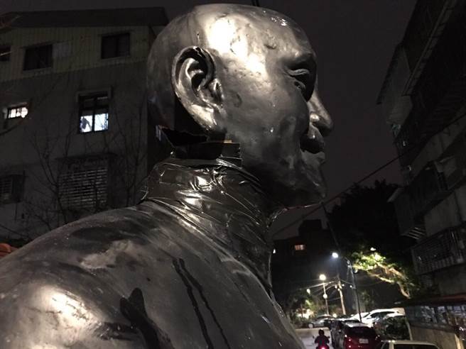 据报道,新北市中和区飞驼小区内设置有一座半身的蒋介石塑料雕像,于12日晚间6时许遭2名男子破坏。一名男子持菜刀直接砍下雕像的头,随意丢弃在一旁座椅上,另一名男子则负责把风并持手机拍照,记录下“砍头过程”。