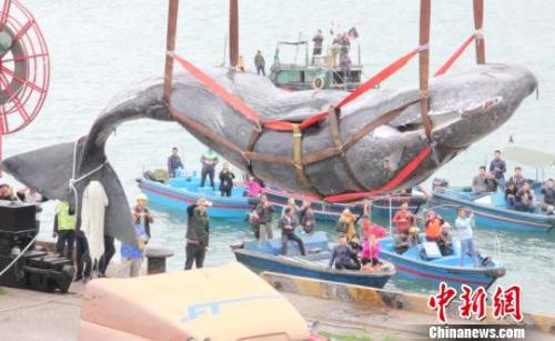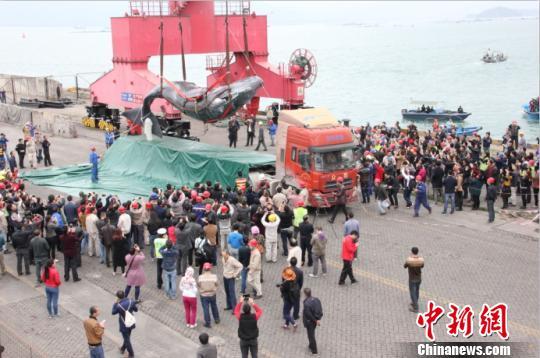 中新网惠州3月15日电(记者 陈文 康孝娟)截至15日16时30分,搁浅在广东惠州大亚湾海域近3天时间的抹香鲸顺利被吊机吊起,放入拖车,包裹好之后将运往位于惠阳区平潭镇的惠州市海洋与渔业科学技术研究中心,加工制作成标本用于科普研究及宣传。