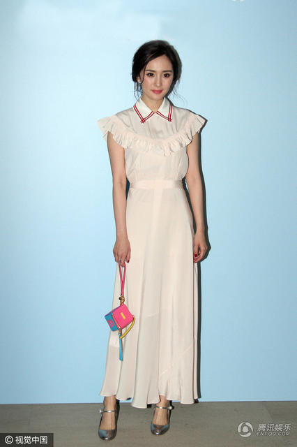 视觉中国讯 2017年3月16日,北京,某品牌活动,杨幂,董洁等女星亮相。杨幂一身白色长裙,走少女风。