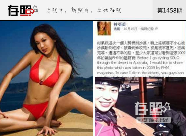 【美女作家死亡预言一语成谶】2013年,台湾人气美女旅游作家林亚若,在澳洲沙漠因车祸身亡,年仅31岁。在出发前,林亚若曾在社交网站提及,若此行发生意外葬礼的安排,没想到一语成谶,“在独自挑战自行车穿越澳洲沙漠之前,我与大家分享这张2009年为杂志拍摄的压箱宝。如果我在沙漠遭遇不幸的话,我的葬礼可用这张照片。”林亚若曾当过7年空姐,之后转行当作家,不时出任电视节目嘉宾,大谈旅行经验。(图左为林亚若晒出的葬礼用的照片,图右上为林亚若的死亡预言,右下为在澳洲沙漠骑行的林亚若)