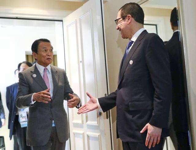 日本财相麻生太郎与美国财长努钦亲切地打招呼