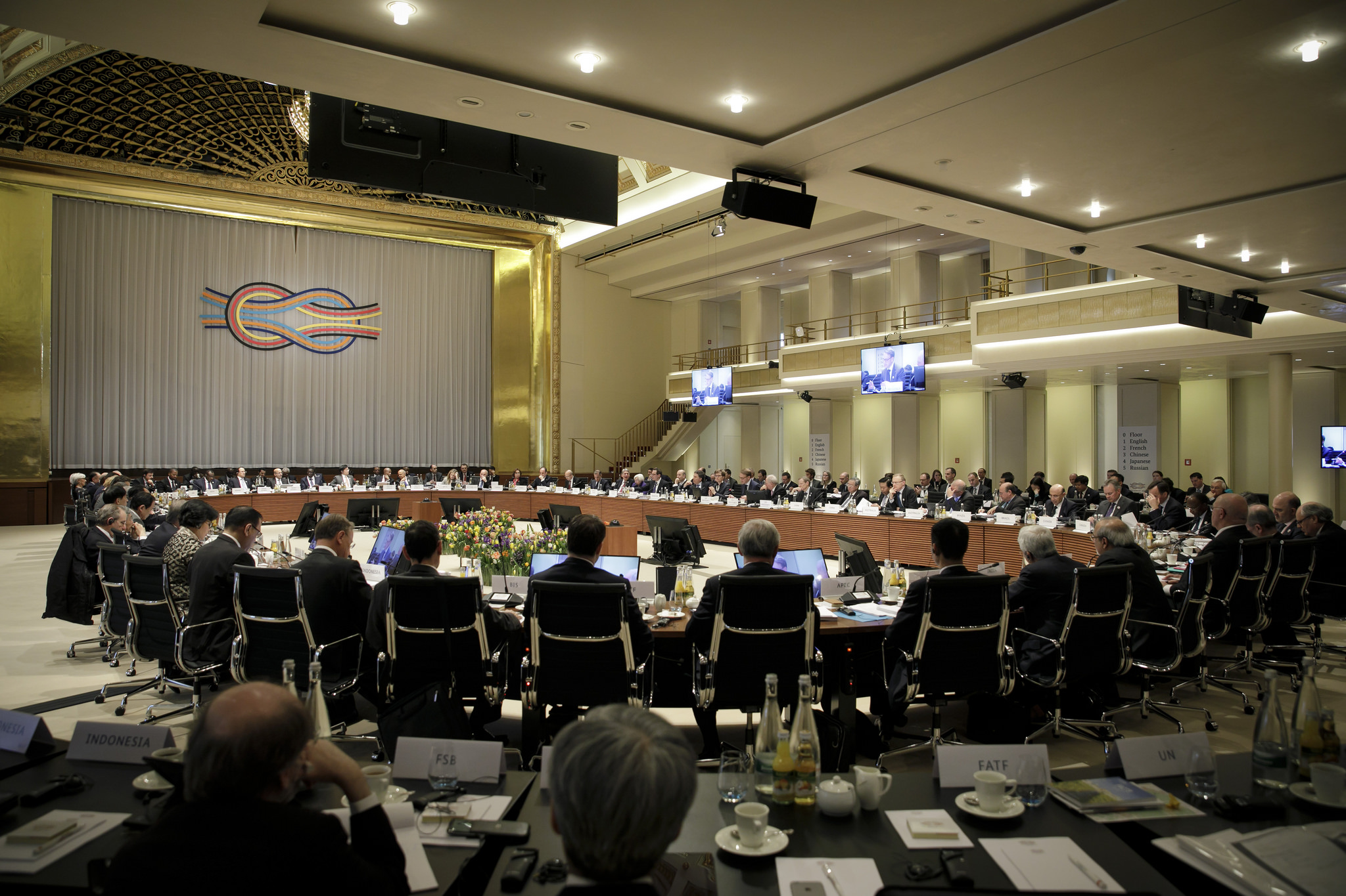 4. 全球央行行长与财政部长圆桌会议,按字母为序,中国、美国、德国、英国在一边, 日本坐在对面。