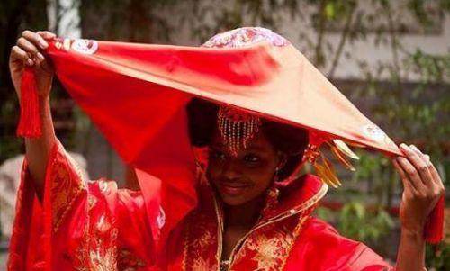 非洲妻子穿着中国传统的红色嫁衣,头顶一块红盖头,不仅让人想起那首:掀起了你的盖头来,让我来看看你的脸,你的脸儿。。。。“不过说实话,这非洲姑娘也是把我们中国嫁衣之美,展现的淋漓尽致的啊!