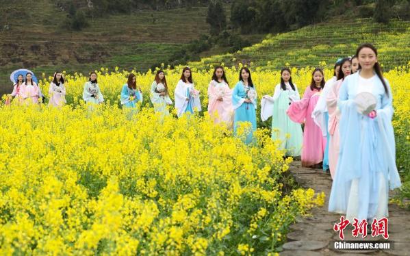 3月19日,一群身着汉服的女子在油菜花田里走秀。当日,贵州省余庆县红渡村举办第二届油菜花节,村外盛开的万亩油菜花田里,汉服爱好者在田间走秀,吸引游客。 中新社记者 贺俊怡 摄