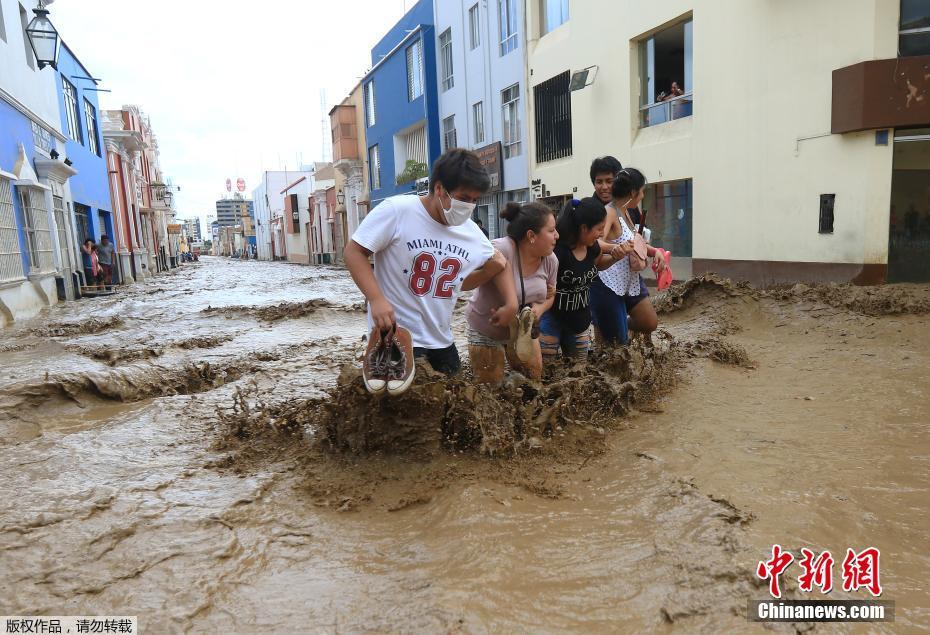 当地时间2017年3月18日,秘鲁特鲁希略,当地遭洪水袭击,居民涉水牵手出行。