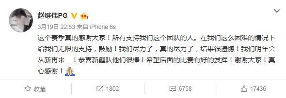 赵继伟则写道:“这个赛季真的感谢大家!所有支持我们这个团队的人。在我们这么困难的情况下给我们无限的支持,鼓励!我们尽力了,真的尽力了,结果很遗憾!我们明年会从新再来…!恭喜新疆队他们很棒!希望后面的比赛有好的发挥!谢谢大家!真心感谢!”