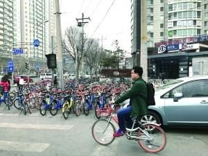 望京地铁站外,每天早高峰各种共享单车都在此停放,有的已经占了机动车和人行道。