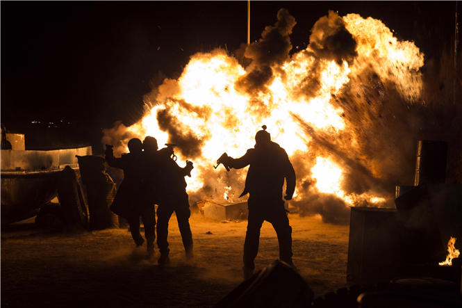 正式实拍前一刻,现场气氛紧张又活泼。一边是三位演员仔细聆听导演讲戏,时不时开开玩笑。另一边是爆炸组工作人员继续不停确认炸点,场工则在一边不停提醒安全事项:“这场戏会有9个炸点爆炸,没有炸完谁都不许进入片场。”现场气氛越发紧张起来。