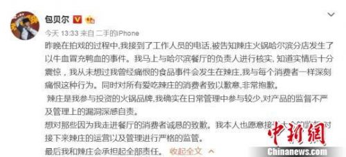 近日,有媒体报道称,哈尔滨一鸭血加工厂用牛血兑水冒充鸭血,产品直供给演员包贝尔参与投资的火锅品牌。包贝尔23日下午通过微博对该事件进行了回应。