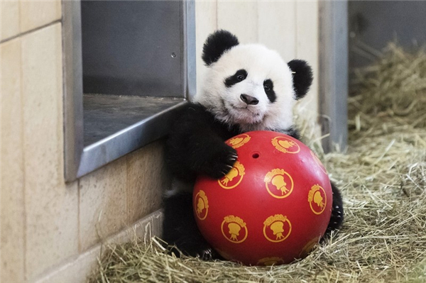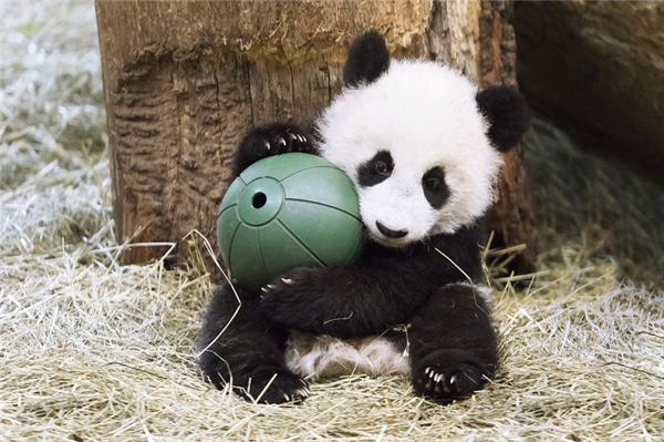 圆滚滚的滚滚抱着比自己还圆滚滚的球,一脸满足~