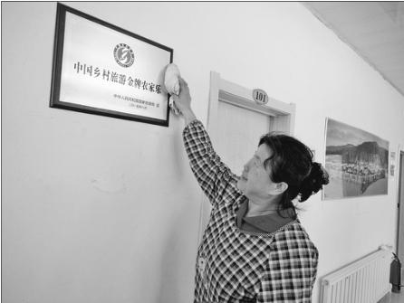图为威虎山雪村大潘客栈获得由国家旅游局颁发的“中国乡村旅游金牌农家乐”,老板娘胡秀英每天都擦拭奖牌,她说:要继续珍惜荣誉,诚信待客,树起金牌农家乐品牌。