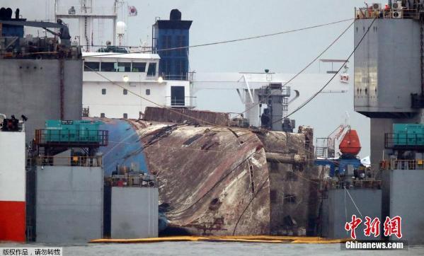 当地时间2017年3月25日,韩国珍岛,“世越”号打捞现场。据韩联社报道,韩国海洋水产部消息称,截至当地时间25日上午4时10分,“世越”号沉船已成功被抬至半潜船上。