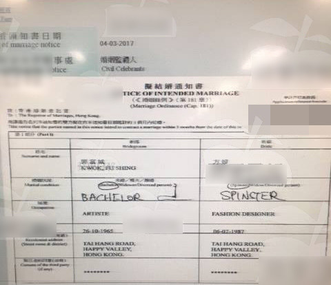 看这张结婚通知书,Moka报称未婚,职业是fashion designer(时装设计师),二人报称同住跑马地大坑道寓所。早前有消息指Moka已怀孕,如属实,郭富城这次真是双喜临门,可喜可贺!