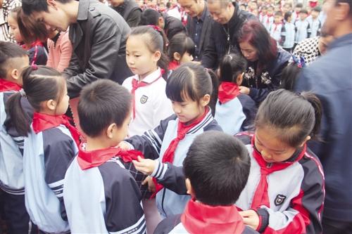 伴随着嘹亮的队歌,学校少先队辅导员罗振美宣布获得批准入队的123名新队员名单。接着,由家长及老队员为新队员们佩戴红领巾。在鲜艳的队旗下,全体少先队员庄严宣誓。庄严的入队仪式使全体少先队员受到心灵的洗礼,进一步明确肩负的光荣使命,坚定了努力学习,继承革命传统,长大后为祖国作贡献的决心。入队仪式在队员们“时刻准备着”的呼号声中圆满结束。