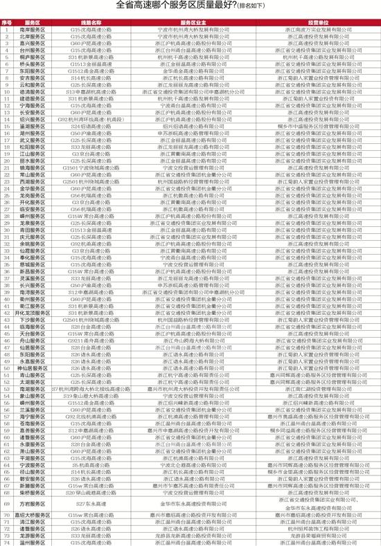 序号服务区线路名称服务区业主经营单位1南岸服务区G15沈海高速公路宁波市杭州湾大桥发展有限公司浙江南波万实业发展有限公司2北岸服务区G15沈海高速公路宁波市杭州湾大桥发展有限公司浙江高速投资发展有限公司3嘉兴服务区G60沪昆高速公路浙江沪杭甬高速公路股份有限公司浙江高速投资发展有限公司4台州服务区G15沈海高速公路浙江台州甬台温高速公路有限公司浙江省交通投资集团实业发展有限公司5桐庐服务区S31杭新景高速公路杭州杭千高速公路发展有限公司杭州杭千高速公路发展有限公司6桥头服务区G1513金丽温高速浙江金丽温高速公路有限公司浙江省交通投资集团实业发展有限公司7东阳服务区G1512甬金高速公路金华甬金高速公路有限公司浙江省交通投资集团实业发展有限公司8安吉服务区S14杭长高速公路浙江杭长高速公路有限公司浙江菊韵人家置业投资管理有限公司9云和服务区G25长深高速公路浙江龙丽丽龙高速公路有限公司浙江省交通投资集团实业发展有限公司10德清服务区S13申嘉湖杭高速公路浙江省交通投资集团有限公司申嘉湖杭分公司浙江省交通投资集团实业发展有限公司11建德服务区S31杭新景高速公路杭州杭千高速公路发展有限公司浙江菊韵人家置业投资有限公司12宁海服务区G15沈海高速公路宁波甬台温高速公路有限公司浙江省交通投资集团实业发展有限公司13长安服务区G60沪昆高速公路浙江沪杭甬高速公路股份有限公司浙江高速投资发展有限公司14绍兴服务区G92杭州湾环线高速(杭甬段)浙江沪杭甬高速公路股份有限公司浙江高速投资发展有限公司15鉴湖服务区S24绍诸高速公路绍兴绍诸高速公路有限公司桐乡市中盛服务区经营管理有限公司16湖州服务区G50沪渝高速公路申苏浙皖高速公路管理有限公司浙江省交通投资集团实业发展有限公司17武义服务区G25长深高速公路浙江金丽温高速公路有限公司浙江省交通投资集团实业发展有限公司18松阳服务区S33龙丽高速公路浙江龙丽丽龙高速公路有限公司浙江省交通投资集团实业发展有限公司19江山服务区G3京台高速公路浙江黄衢南高速公路有限公司浙江省交通投资集团实业发展有限公司20丽水服务区G25长深高速公路浙江金丽温高速公路有限公司浙江省交通投资集团实业发展有限公司21镇海服务区G1501宁波绕城高速公路宁波交投营运管理有限公司浙江高速投资发展有限公司22常山服务区G60沪昆高速公路浙江省交通投资集团杭金衢分公司浙江省交通投资集团实业发展有限公司23西湖服务区G2501杭州绕城高速公路杭州国益路桥经营管理有限公司浙江菊韵人家置业投资管理有限公司24金华服务区G60沪昆高速公路浙江省交通投资集团杭金衢分公司浙江省交通投资集团实业发展有限公司25龙岗服务区G56杭瑞高速公路浙江杭徽高速公路有限公司浙江省交通投资集团实业发展有限公司26开化服务区G3京台高速公路浙江黄衢南高速公路有限公司浙江省交通投资集团实业发展有限公司27临安服务区G56杭瑞高速公路浙江杭徽高速公路有限公司浙江省交通投资集团实业发展有限公司28嵊州服务区G15W常台高速公路浙江沪杭甬高速公路股份有限公司浙江高速投资发展有限公司29龙泉服务区G25长深高速公路浙江省交通投资集团实业发展有限公司浙江省交通投资集团实业发展有限公司30青田服务区G1513金丽温高速浙江金丽温高速公路有限公司浙江省交通投资集团实业发展有限公司31庆元服务区G25长深高速公路浙江省交通投资集团实业发展有限公司浙江省交通投资集团实业发展有限公司32余姚服务区G92杭甬高速公路浙江沪杭甬高速公路股份有限公司浙江高速投资发展有限公司33仙霞服务区G3京台高速公路浙江黄衢南高速公路有限公司浙江省交通投资集团实业发展有限公司34奉化服务区G15沈海高速公路宁波甬台温高速公路有限公司浙江省交通投资集团实业发展有限公司35慈城服务区G15沈海高速公路宁波交投营运管理有限公司浙江高速投资发展有限公司36新昌服务区G15W常台高速公路浙江沪杭甬高速公路股份有限公司浙江高速投资发展有限公司37灵溪服务区S33龙丽高速公路浙江龙丽丽龙高速公路有限公司浙江省交通投资集团实业发展有限公司38长兴服务区G50沪渝高速公路申苏浙皖高速公路管理有限公司浙江省交通投资集团实业发展有限公司39南浔服务区S12申嘉湖高速公路浙江省交通投资集团有限公司申嘉湖杭分公司浙江省交通投资集团实业发展有限公司40衢州服务区G60沪昆高速公路浙江省交通投资集团杭金衢分公司浙江省交通投资集团实业发展有限公司41衢江服务区S31杭新景高速公路浙江省交通投资集团杭金衢分公司浙江省交通投资集团实业发展有限公司42开化龙顶服务区S31杭新景高速公路浙江省交通投资集团杭金衢分公司浙江省交通投资集团实业发展有限公司43下沙服务区G2501杭州绕城高速公路杭州国益路桥经营管理有限公司浙江菊韵人家置业投资管理有限公司44临海服务区S28台金高速公路浙江台州甬台温高速公路有限公司浙江省交通投资集团实业发展有限公司45天台服务区G15W常台高速公路浙江沪杭甬高速公路股份有限公司浙江高速投资发展有限公司46舟山服务区G9211甬舟高速公路 浙江舟山跨海大桥有限公司 浙江省交通投资集团实业发展有限公司47仙居服务区S28台金高
