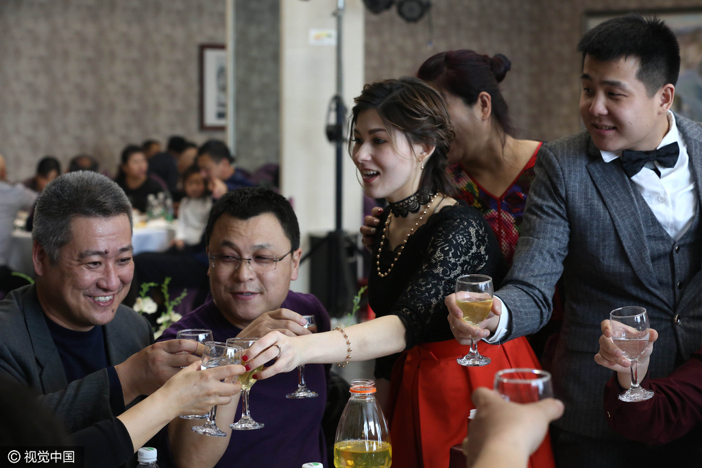 五年前,休莎来到黑河市留学,主攻中文,她不但被中国博大精深的民族文化所折服,还把中文讲的非常的地道,能说一口标准的中文,并了解了中国人的思维逻辑。大学毕业后,休莎并没有着急返回俄罗斯,而是在黑河市一家商贸公司参加了工作。图为两人婚礼现场。