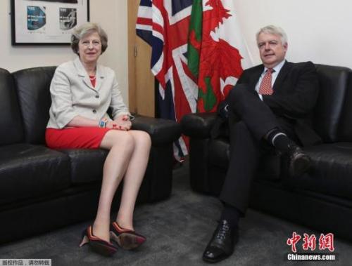 资料图:当地时间2016年7月18日,英国卡迪夫,英国新任首相特蕾莎·梅与威尔士第一大臣卡因·琼斯(Carwyn Jones)会面。特蕾莎·梅穿红色短裙配彩色手镯,一双大长腿十分抢镜。