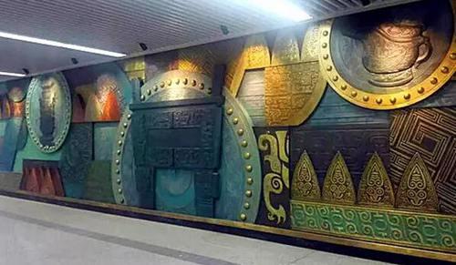 这是郑州地铁2号线二里岗站主题文化墙《青铜薪火》,这部作品中将司母戊鼎、共父乙觥、莲鹤方壶等青铜器代表作全部展现。这面文化墙已成为这个站点的标志性符号。这面文化墙满满的“中国风”、浓重的“黄河印记”让人们在步履匆匆的行程中也能享受历史文化的璀璨魅力。