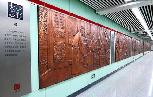 安徽合肥地铁1号线包公园站以现代与传统艺术相结合的“包公廉洁文化墙”“包公脸谱文化墙”浮雕壁画、灯箱等为载体,展示了生于合肥的宋代名臣廉吏包拯在不同时期的主要事迹,如包拯在香花墩读书时少存大志、在执掌开封府时带领百姓抗洪救灾、为监察御史时不畏权贵七次弹劾贪吏……
