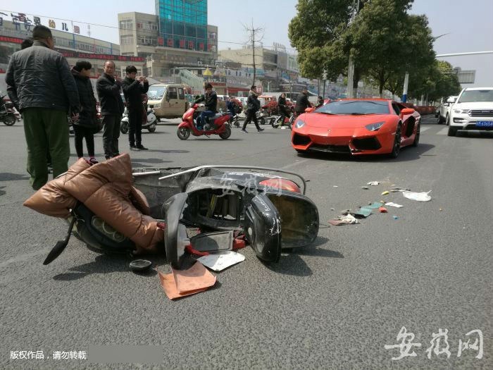 2017年中午11时30分左右,位于安徽省蚌埠市闹市区主干道上的东海大道上发生一起车祸,一辆价值不菲的兰博基尼跑车与一辆电瓶车发生碰撞。