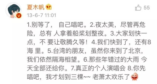 于是,困在路上的歌迷与萧天王微博互动,各种神回复层出不穷。“夜太美,尽管再危险,总有人拿着船桨划整夜”。