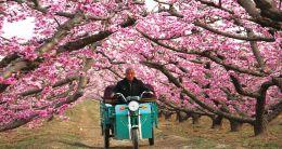 ①桃花映红霞满天,桃林烈烈似火燃。临猗县桃树种植面积近10万余亩,每年桃花盛开的时候,桃林如霞灿灿、如火烈烈,煞是好看,吸引了县内外众多游客前来观光踏青。图为该县角杯乡石彪村桃林间骑车行走的老人。