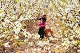 ④又是一年梨花开,千片万片如雪白,图为在该县黄斗景村梨花观光景区梨林里授粉的梨农。