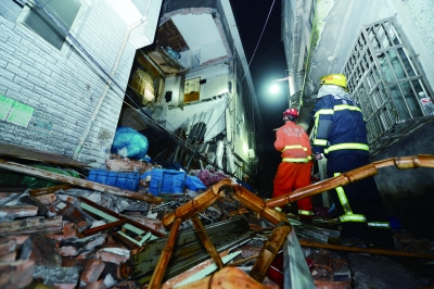他听到“砰”的一声巨响就赶紧从家里跑出来了,发现路面有位妇女头部被砖块砸伤昏迷倒地,腿部也被砸伤。原本的楼房最上层悬挂空中,底下完全坍塌。