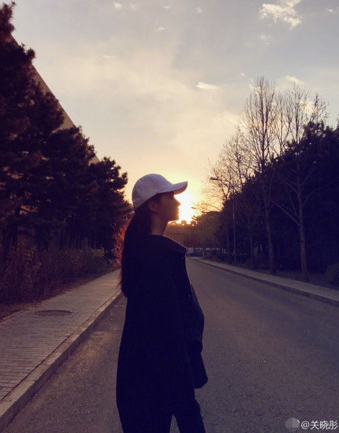 关晓彤在夕阳下拍照。