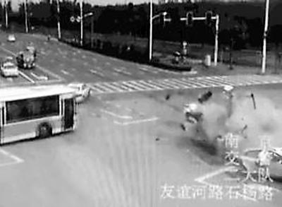 2015年6月20日,在南京市繁华路段——友谊河路与石杨路交叉口,发生一起惨烈车祸。一辆宝马七系轿车高速闯红灯通过路口,撞上正在左转弯的一辆马自达轿车。马自达轿车被撞解体,车上两人当场死亡。图为案发现场(资料照片)。