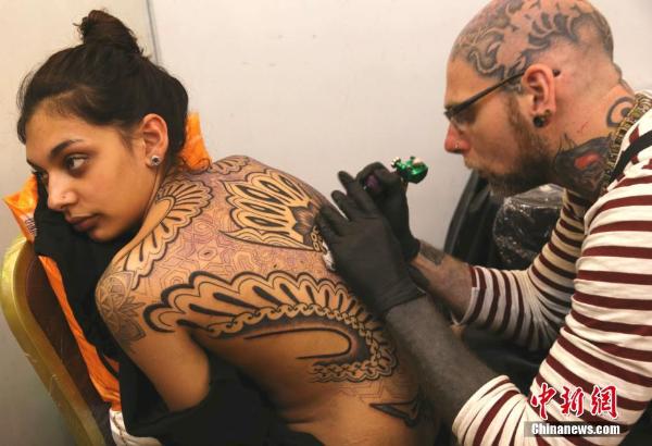 3月31日至4月2日是尼泊尔第7届国际纹身大会。由于受嬉皮士文化影响较深,纹身在尼泊尔比较流行。此次大会吸引了不少纹身爱好者参与。图为一位正在接受纹身的女士。中新社记者 张晨翼 摄