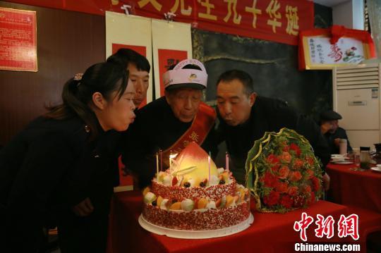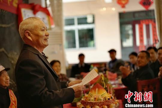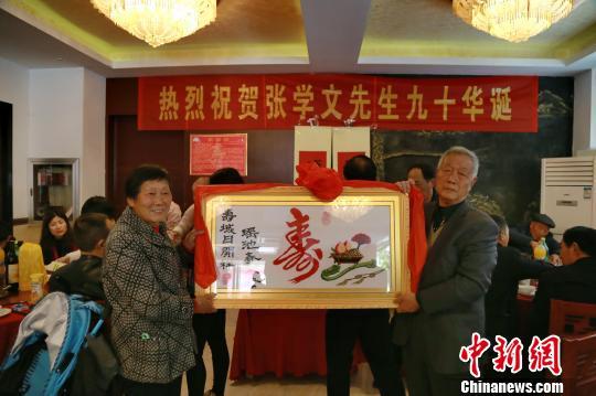中新网肥东4月2日电(许庆勇 万戈)4月2日,清明小长假的第一,在安徽肥东县撮镇镇,百名古稀老人和亲朋好友齐聚一堂,为撮镇中学退休老师张学文做九十大寿,感谢他为教育做出的贡献。这些古稀老人都是张学文的学生,他们的年龄都超过70岁,最大的学生年近八旬。望着眼前的情景,张学文老人显得非常高兴和激动。他说,活了这么大,这群白发苍苍的学生们都还能记得我,我真的很满足很幸福!