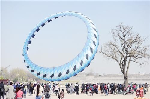 4月1日,风筝爱好者在大明宫御道广场放飞巨型“地滚龙”风筝 新华社发
