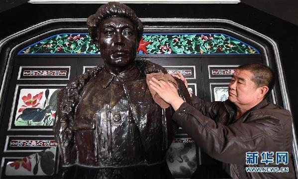徐永军在通化市靖宇陵园擦拭杨靖宇雕像(3月17日摄)。新华社记者王昊飞摄